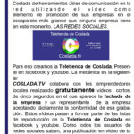 COSLADA.TV colabora con los emprendedores locales realizando gratuitamente vídeos cortos, de cinco segundos en el que aparece la fachada de la empresa y un representante de la empresa aceptando tácitamente la conformidad de esa grabación. Estos vídeos pasan a formar parte de las listas de reproducción de la Teletienda de Coslada en facebook y youtube. Como todos los usuarios de redes sociales saben, una publicación en vídeo de tu localidad llama un 70% más la atención que una foto o publicación escrita.